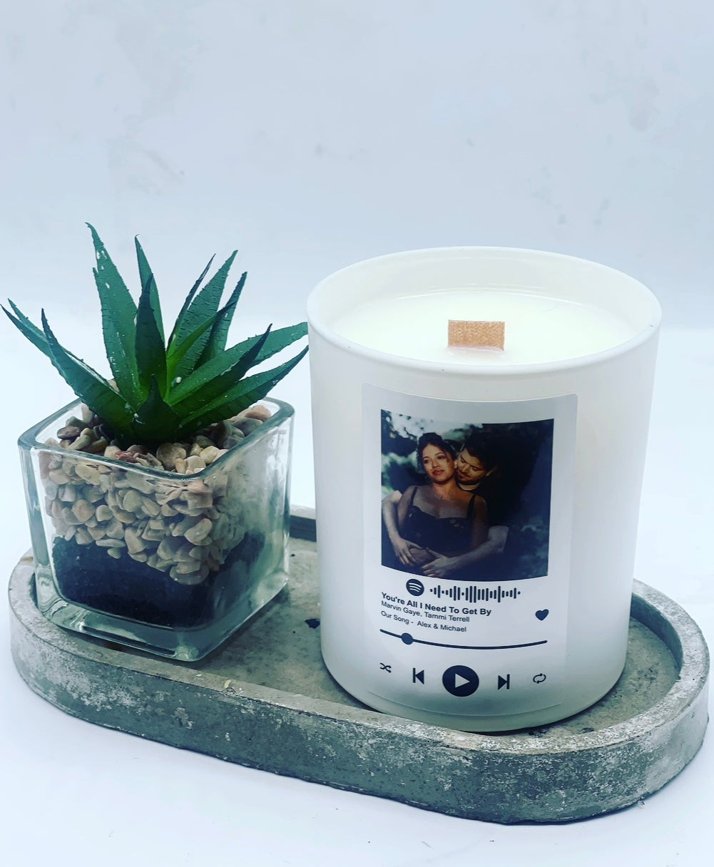 Whether it’s a Birthday, Wedding, or celebratory gift. Gift in style with our photo music candle. Pick your photo, pick your song, playlist or album, pick your caption and scent.