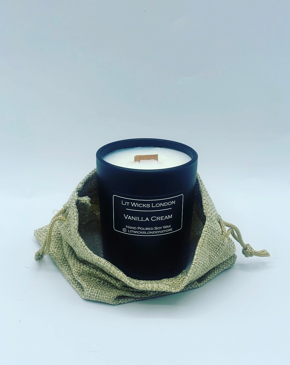 Light up your space with the sweet and soothing scent of our vanilla cream soy wax candle! This glass of warmth and happiness is exactly what you need to unwind after a long day. Vanilla Cream - A rich mouthwatering scent smoothed by vanilla pods and hints of creamy coconut, white chocolate and a whisper of fresh candyfloss alongside a hint of warm spice.